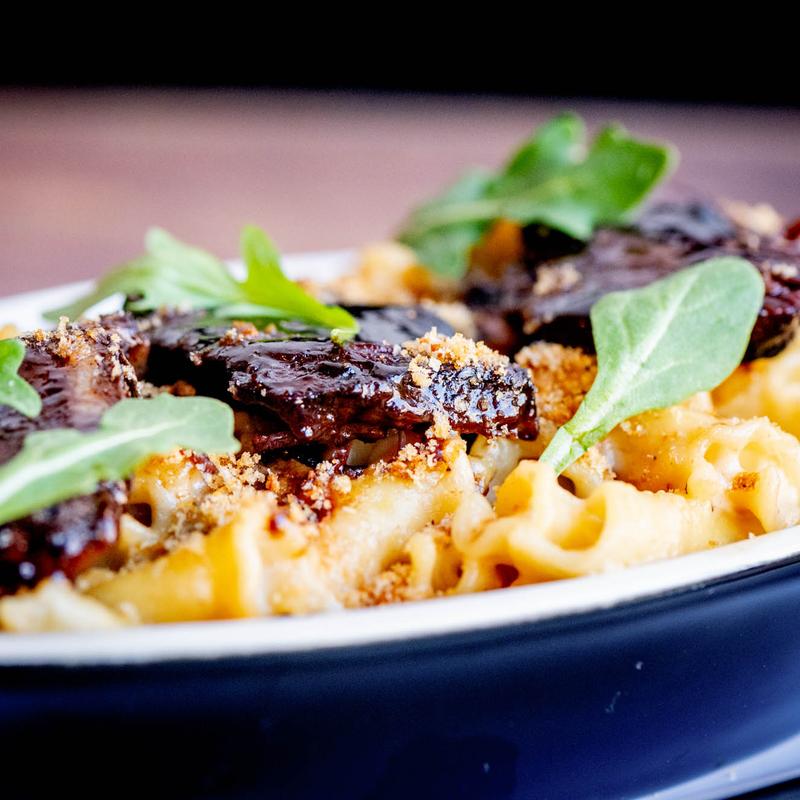 Bacon Mac Topped With Crispy BBQ Pork Belly & Crispy Shallots