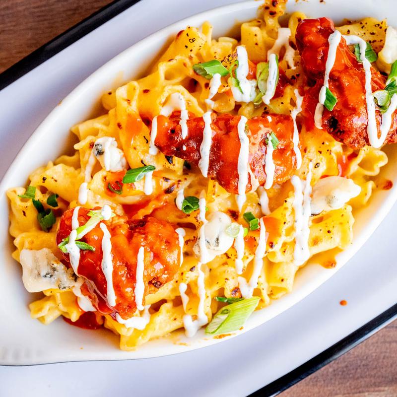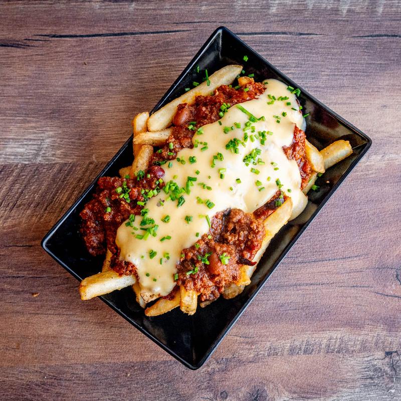 OG mac sauce, bean chili, onions, cilantro, jalapeño, tortilla strips