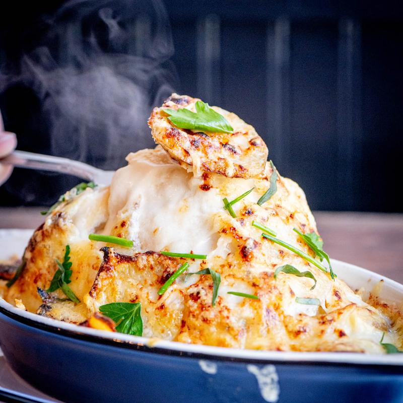 Yukon gold potato, gruyère, parmesan sauce, caramelized onion, truffle, fine herb salad