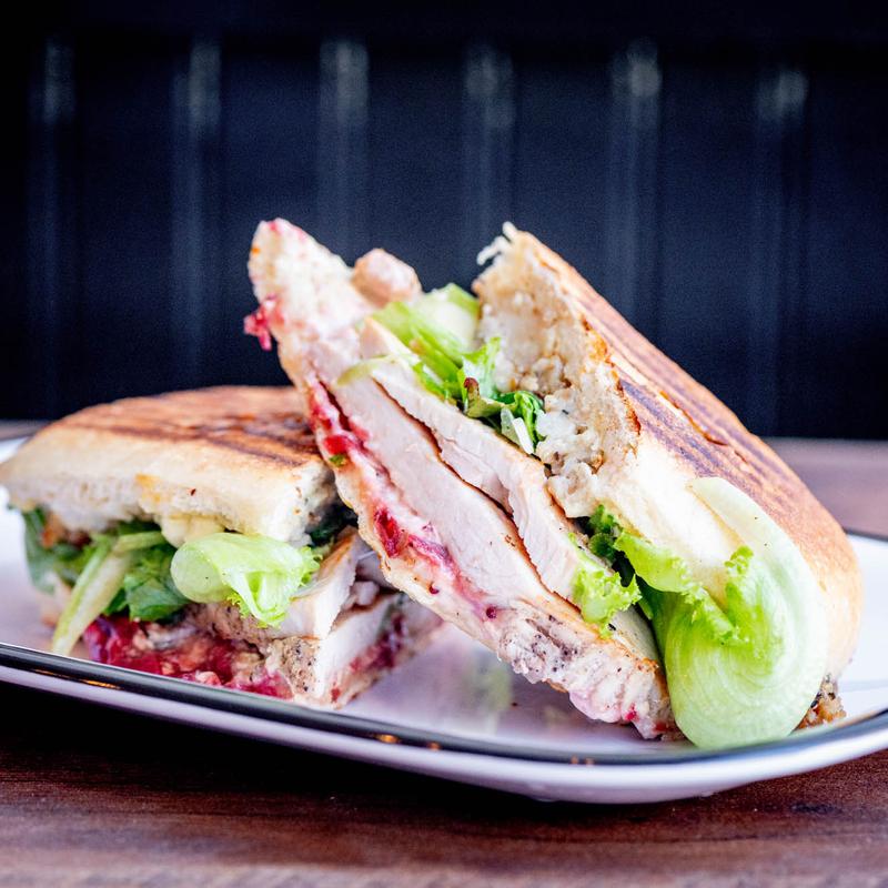 House roasted turkey breast, rosemary stuffing, cranberry compote, garlic aioli, dressed lettuce