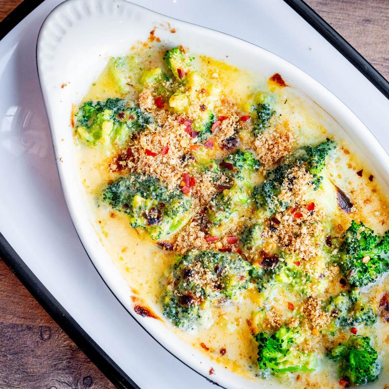 Broccoli and cheese, toPped with crumb and Calabrian chili's