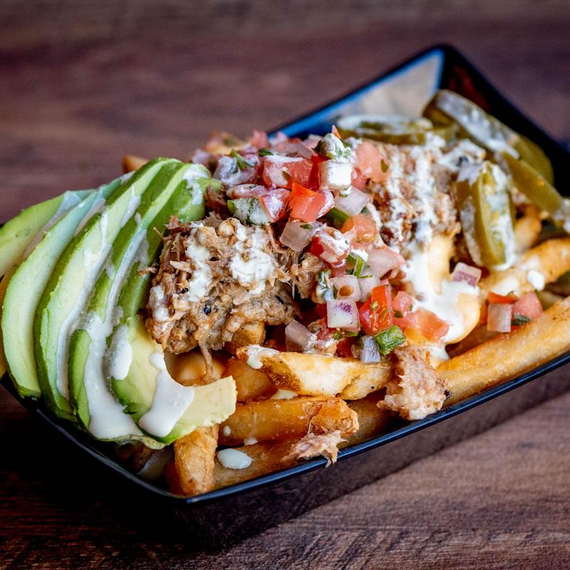 Verde pulled pork, nacho cheese, pico, jalapeños, avocado, sour cream
