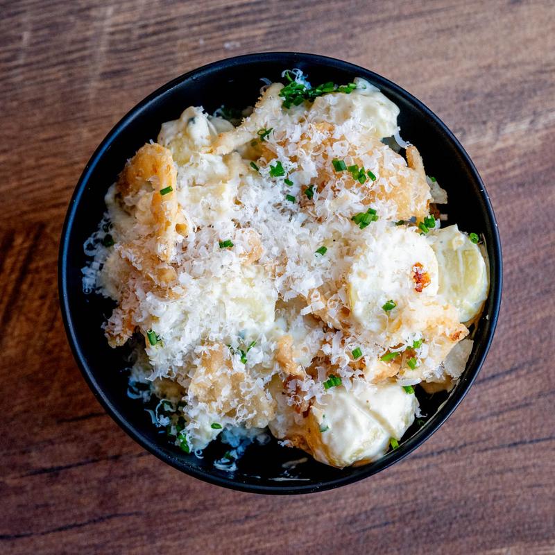 Fingerling potato, chive, crispy shallot, pecorino, garlic aioli